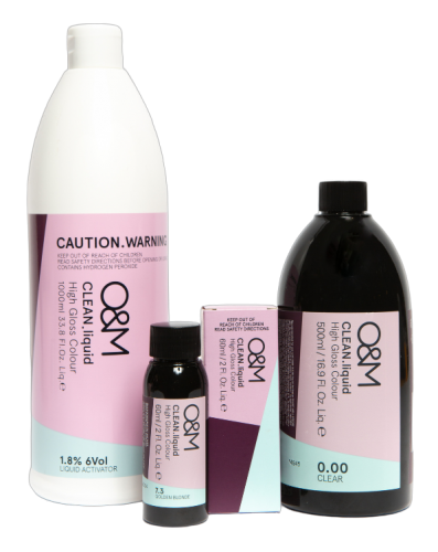 O&M CLEAN-liquid High Gloss Colour gut schütteln- Keine Metallwerkzeuge (z-B- Schalen, Klammern, Kämme) verwenden- Mische 60 ml CLEAN-liquid High Gloss Colour mit 60 ml CLEAN-liquid Aktivator (1:1)- Nicht abdecken oder einwickeln.