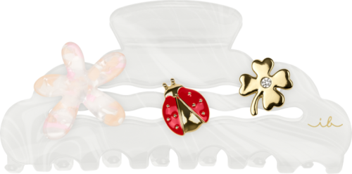 La invisibobble MYCLAW Full of Charms est un véritable statement piece – stylé, modulable et plein de personnalité. La pince blanc nacré est accompagnée de charms dorés – parmi lesquels un cœur, un trèfle, un nœud, une coccinelle et une fleur, fabriqués dans différents matériaux.